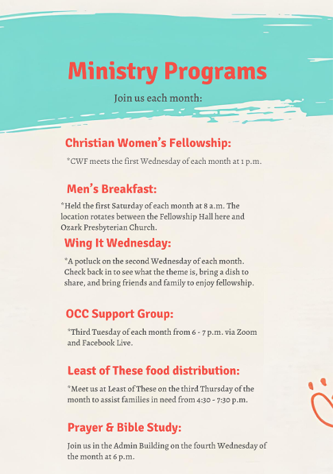 November 1 - Men's Breakfast 8 a.m. Fellowship Hall